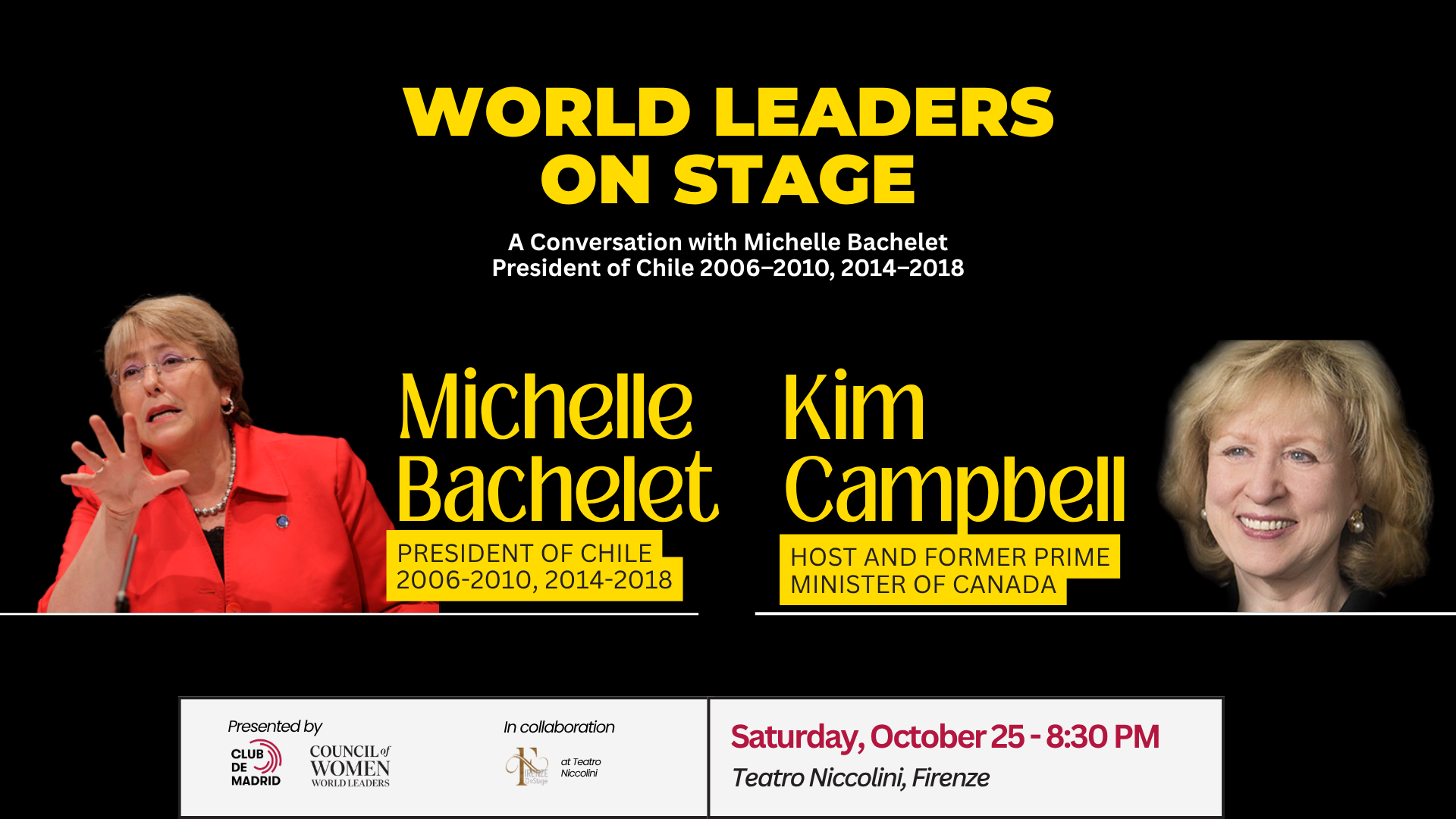 Michelle Bachelet, President of Chile from 2006 to 2010 and from 2014 to 2018, Vice-President of Club de Madrid, comes to Florence to speak with Kim Campbell, former Prime Minister of Canada, Member of Club de Madrid and co-founder of the Council of Women World Leaders.